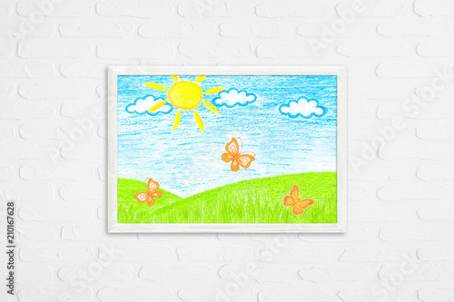 Frame Mock Up On White Bricks Wall With Colored Pencils Drawing