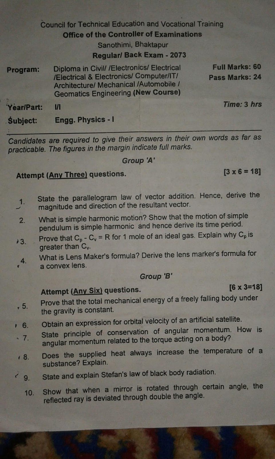 Ctevt Engineering Physics I Question Paper 2073 Diploma