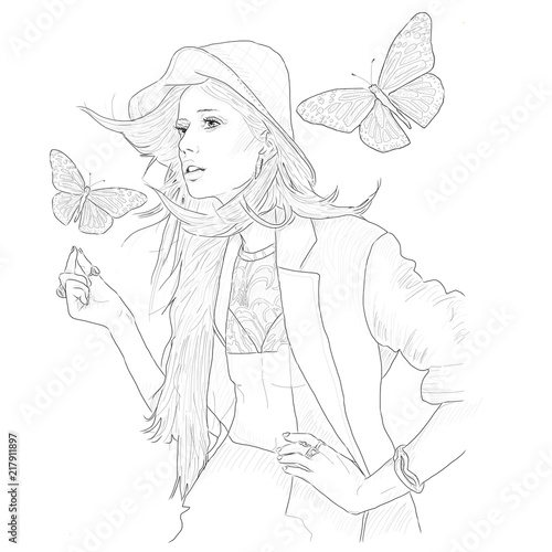 Zentangle Style Swirl Girl Blowing Butterfly Stock Vector Royalty