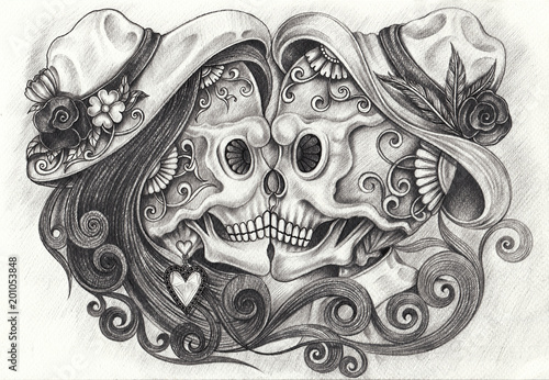 Art Design Kiss Couples Skull Day Of The Dead Hand Pencil Drawing