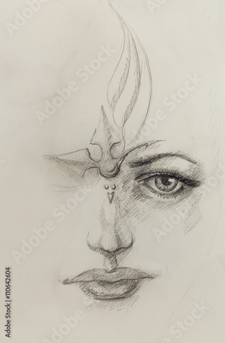 Mystic Woman Face And Headband Pencil Drawing On Paper Stock