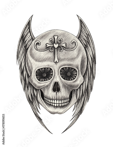 Art Design Wings Angel Skull Tattoo Hand Pencil Drawing On Paper
