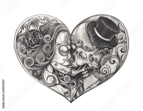 Art Couple Kiss Skulls Tattoo Hand Pencil Drawing On Paper Buy