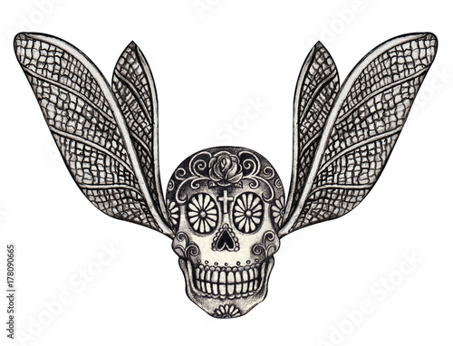 Art Design Wings Dragonfly Skull Hand Pencil Drawing On Paper