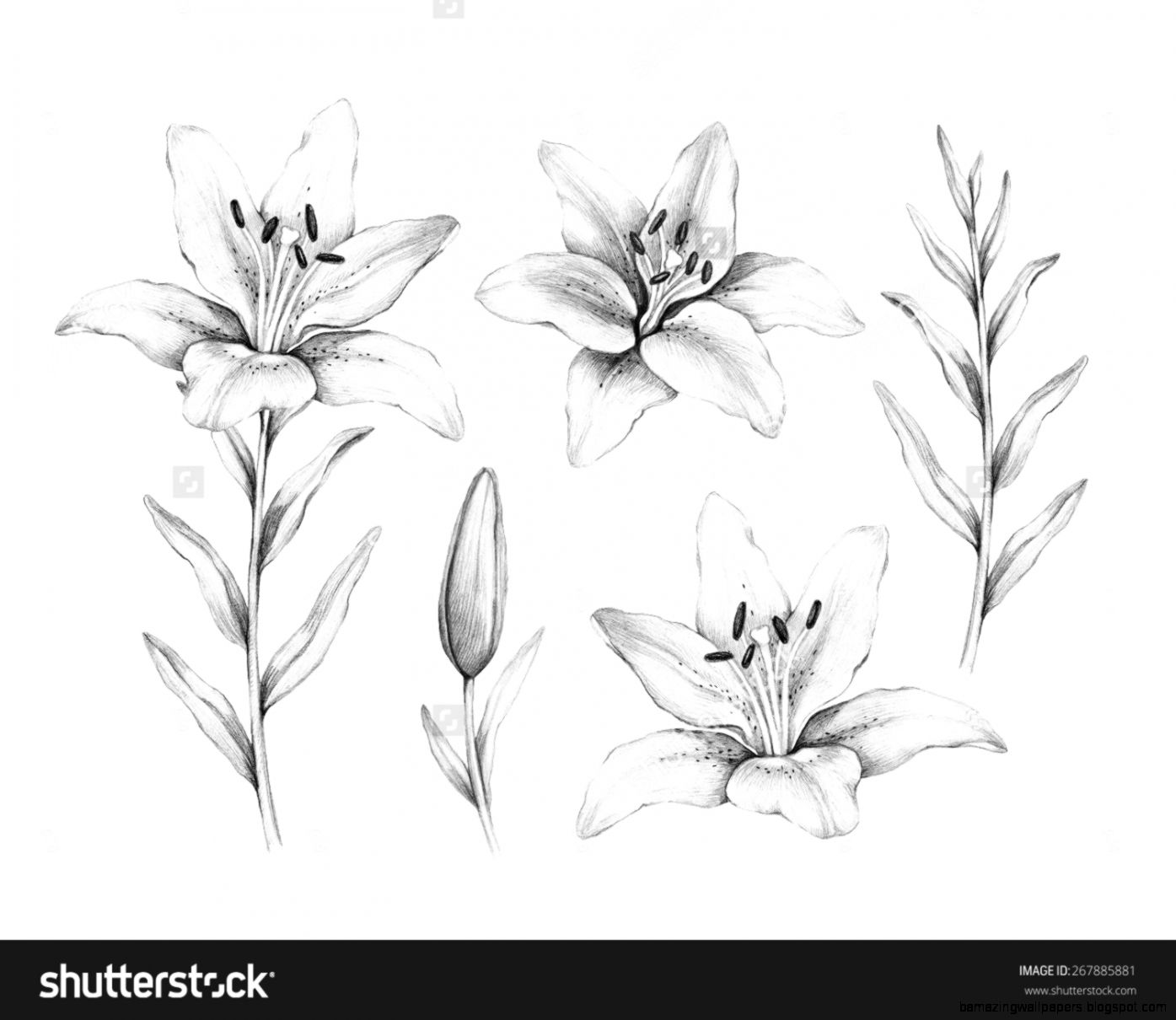 Beautiful White Lily Flowers Pencil Sketch Image Of A Beautiful