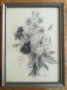 Antique Old 1878 Original Pencil Drawing Flowers By Henrica